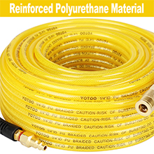 This reinforced polyurethane air hose is 1/4-Inch inner diameter by 100-Feet long. It is made of polyurethane material which makes this air hose resists kinking, abrasion, UV radiation, electricity, oil, chemicals and heat. 300 PSI working pressure. Flexible at -40 to +150 degree F. This air hose is also Installed 1/4" heavy duty industrial quick coupler and plug for convenient to contact air compressor and air tools. The bend restrictors reduce kinking and help to increase the life of the hose