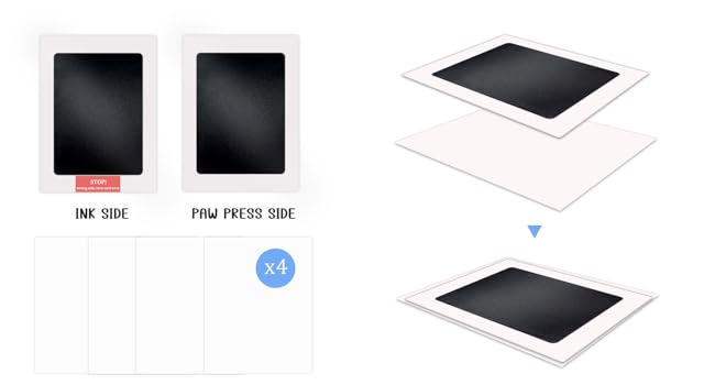 The ink pads have an inked side and paw press side (inkless), simply place the imprint paper under the inked side and press your pet's paw on the inkless side to get a paw print. Very simple! One ink pad comes with four imprint papers, and the ink pads can be used 3-4 times.