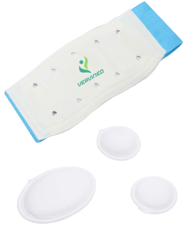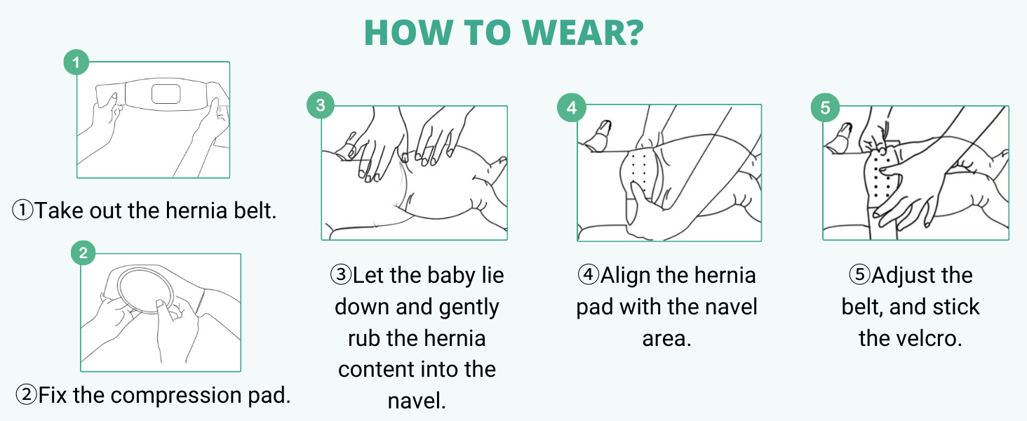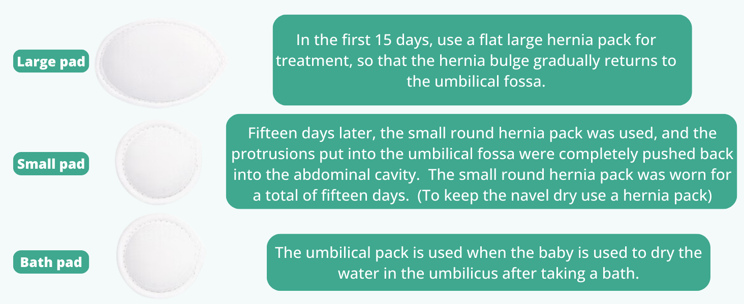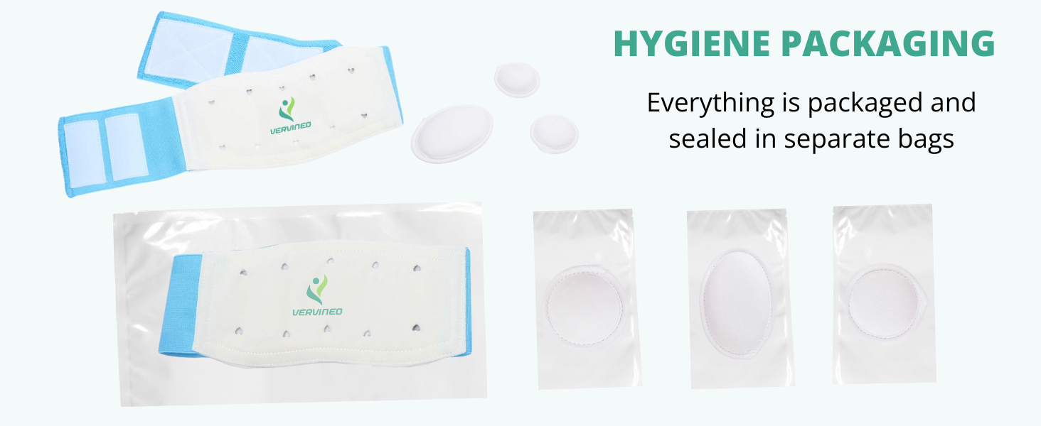 The package includes a belly band and three interchangeable support pads, each sealed in separate hygienic bags. Instructions are also included to guide you on which padding to use at different stages of your baby’s recovery.
