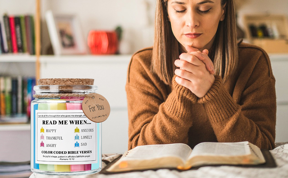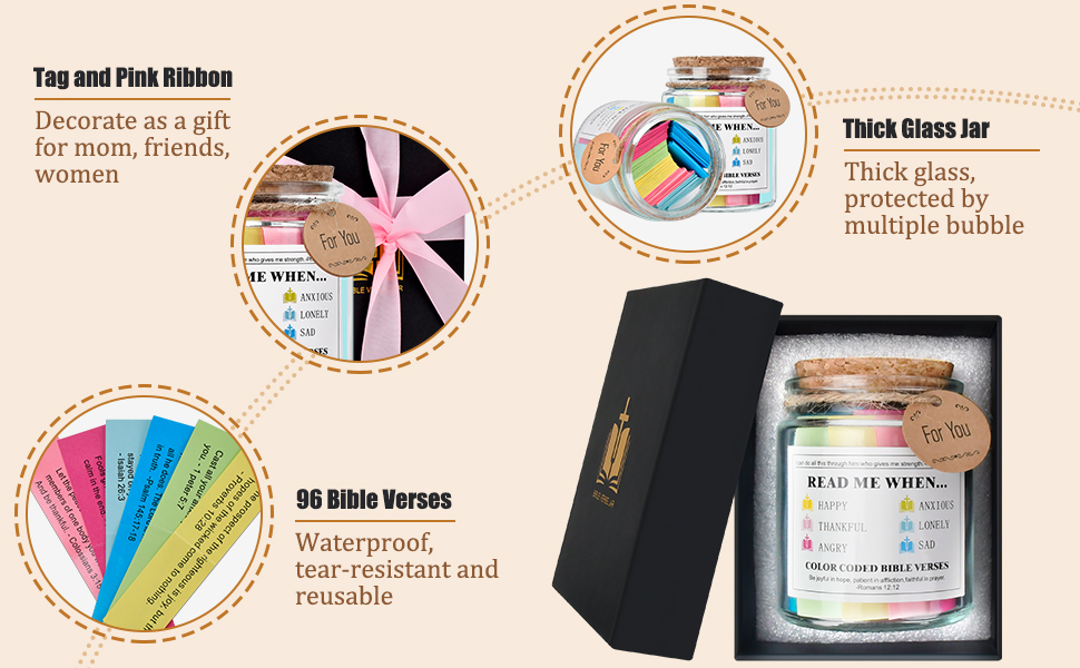 Bible jar contains 96 verses, coded according to six emotions, for daily prayer or emotional adjustment!